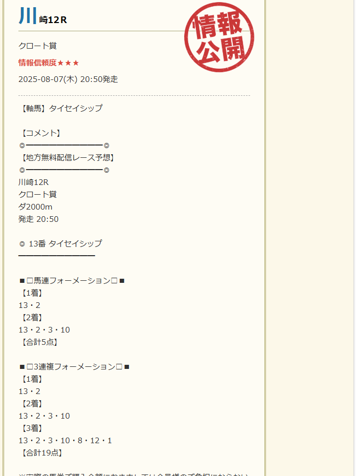 8月7日(木)地方競馬無料予想的中