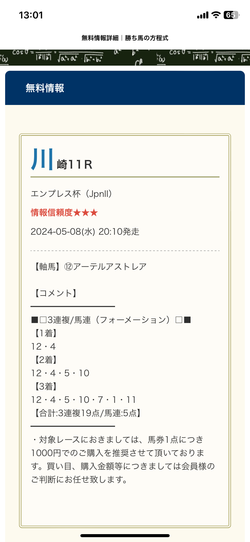 平日の無料予想でこれだけ高配当は本当に感謝しかありません。