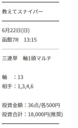 3番人気×4番人気の馬連を買い目点数6点で無料予想としてもらって